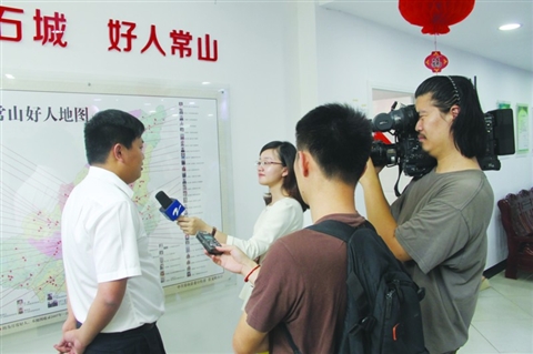 常山是“最美衢州人”的发源地,6月5日下午,浙江日报、浙江之声、浙江卫视、浙江在线、钱江晚报等媒体聚焦我县,参观和采访了“好人工作室”、好人街、好人林和“最美爷爷”占祖亿家等,感受了“好人之城”的魅力,纷纷表示要大力宣传“好人常山”这张金名片。图为浙江卫视正在采访“最美浙江人———2012青春领袖”张盛鑫。
