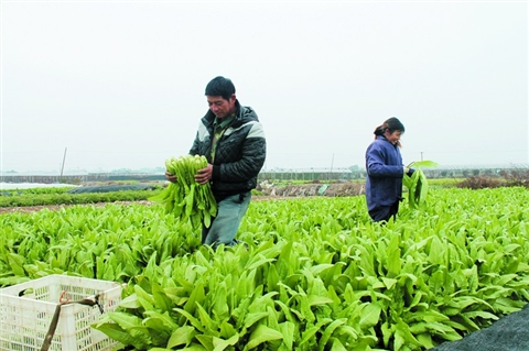 一批来自江西省抚州市的农民落户同弓现代农业园区,抱团流转土地,规模种植蔬菜。据悉,最初只有一两户农民过来,现在已经有10余户,种植面积也扩大到40多亩,所种蔬菜销往本县和江山市农贸市场,每户年收入有10多万元。图为12月10日上午,江西菜农沈时义夫妇在收割油麦菜。 记者朱爱良摄