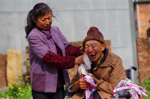 昨日,记者来到古县畈村,找到徐宝英的家。走到院子,只见一名男子正坐在轮椅上晒太阳。他的嘴里咬着一条毛巾,轮椅旁还有十多条毛巾。“这些毛巾能够派上大用场,多的时候一天要洗100多条呢!”徐宝英说,坐在轮椅上的便是她的丈夫毛雨良,因他不能控制住自己,一天到晚都会流口水,所以只能让他自己咬着毛巾。将丈夫安顿好后,徐宝英开始讲述他们的故事。