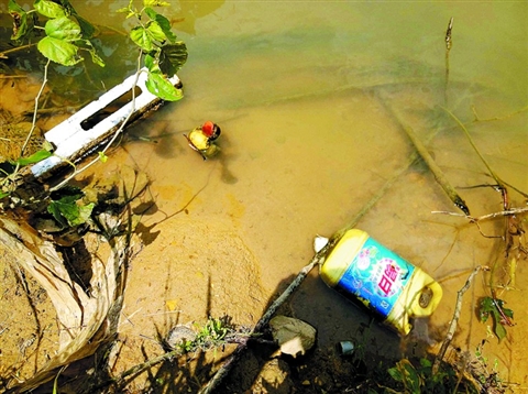 昨日,记者来到芳村镇泮坑村,只见村内水塘边散落着破玩具、泡沫盒、废瓶子等生活垃圾。记者 汪芳 摄
