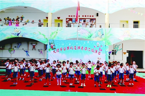 6月25日下午,心连心幼儿园大班的小朋友们迎来了人生中的第一个毕业典礼,孩子们的特色课汇报演出赢得现场阵阵掌声。图为大班小朋友表演幼儿毕业诗手语 《老师谢谢您》。