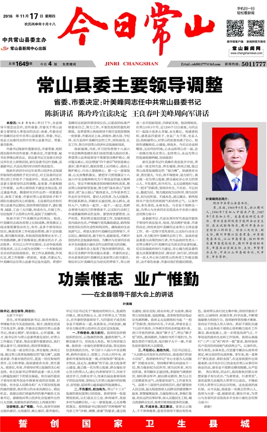 新任县委书记叶美峰在表态发言中说,常山是一座文明古县、养生福地、休闲之城,接过常山改革发展稳定的“接力棒”,深感使命光荣、责任重大。今后,将不辱使命,奋力前行。真正做一名为常山发展、群众福祉尽心尽力的常山人。不负重托,担当有为。义无反顾地担当起“一把手”的职责,坚持冲在先、干在前。不忘初心,勤政为民。努力做到权为民所用、情为民所系、利为民所谋。不减本色,清正廉洁。始终保持共产党员的昂扬锐气和浩然正气,以身作则,率先垂范,永葆本色。与全县干部群众一起,为常山与全省同步实现高水平全面小康社会而努力奋斗!
