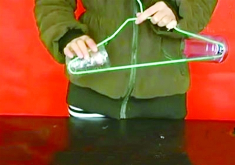 3.把剪好的矿泉水瓶分别套在晾衣架的两端,这样就做好了。