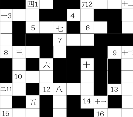 纵向:一、脉冲;二、女驸马;三、锋芒毕露;四、人马座;五、赛尔号;六、江西;七、里约热内卢;八、湖笔;九、马口铁;十、卢沟晓月;十一、中听;十二、平常心;十三、义和团;十四、读者。