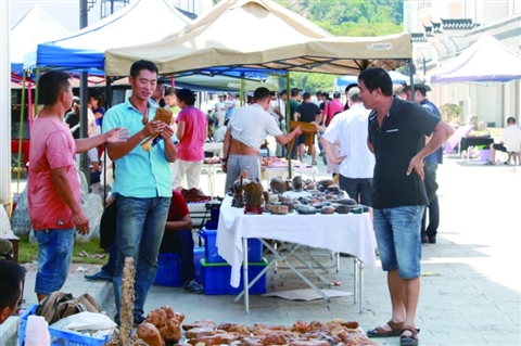 8月29日上午,记者在中国观赏石博园内看到,市场交易区里的商家已摆出了各式奇石,吸引了不少游客驻足观看、探讨,让游客提前过了一把赏石瘾。图中游客与商家在讨论石头品质。