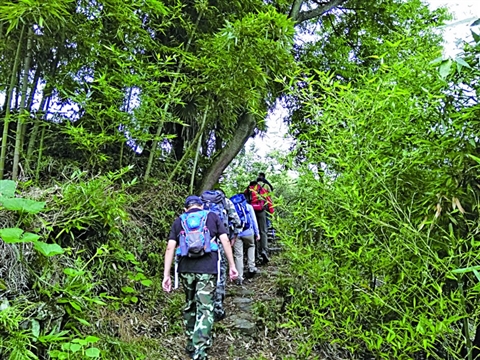 从大源山返程,我们翻过大源山岗,向百亩自然村、洞门口结集地一路徒行。只见一条山路像玉带般飘逸在绵延崇山间,这是为了方便采摘油茶,前些年村里专门修筑的,虽然有些地方被山洪冲塌,但农用三轮车仍可通行。崎岖的古道,留下了前人坚韧的足迹,而这条盘旋绿丛的山路,更展现了现代人那执着的身影。现在山里人都下山脱贫搬离了,除了我们这些驴行者,已很少有人进山。退耕还林之后,这里生态环境更好了,山腰翠竹临风,崖间松柏斜弋,沿途芳草青葱,金黄的枇杷挂满枝头,弥猴桃、杨梅、柿子、脆李、乌挑、草莓等野果漫山遍布,山间有雄风狮吼、金蟾望月的岩石,形态各异,神情惟妙,山峰清奇俊秀,恰似一幅优雅唯美的风景画。