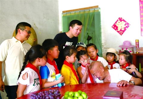 “看,我头上的疤!”7月31日下午,县青少年活动中心组织10余名红领巾小志愿者开展“八一寻访抗战老兵献上心中的敬意”活动。图为紫港街道97岁抗战老兵刘熄太为小志愿者讲述与鬼子拼刺刀的情景。 通讯员何丽春摄