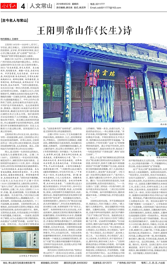 嘉靖六年(1527年),王阳明奉命出征广西平思田之乱的途中路过常山。在常山逗留时曾作《长生》诗(见《王阳明全集》),诗曰:“长生徒有慕,苦乏大药资。名山遍深历,悠悠鬓生丝。微躯一系念,去道日远而。中岁忽有觉,九还乃在兹。非炉亦非鼎,何坎复何离?本无终始究,宁有死生期?彼哉游方士。诡辞反增疑。纷然诸老翁,自传困多岐。乾坤由我在,安用他求为?千圣皆过影,良知乃吾师。”诗的大致意思是,长生往往只是一种自己的念想,世间没有灵丹妙药可以供给。访遍名山大川,历经悠悠岁月,两鬓生出丝丝白发也无济于事。微贱的身躯一旦被私念所系,偏离(致良知的)大道就越来越远了。中年之后内心忽然有了觉悟,返老还童的灵丹就在这里。不用炉也不用鼎来炼丹,也无须来算坎卦、算离卦。(致良知)本来就不必考究开始和结束,难道它还有死生期?那些游荡江湖的方术之士多么可笑,他们诡异的言论反而增加了人们的猜疑。许多寿星,缘由各不相同,其实难以找到相同的途径。内心蕴涵着宇宙间的乾坤变化,还需要另外寻求解除困惑的东西?历史上无数圣人只是过眼云烟,良知是我们人生真正的导师。