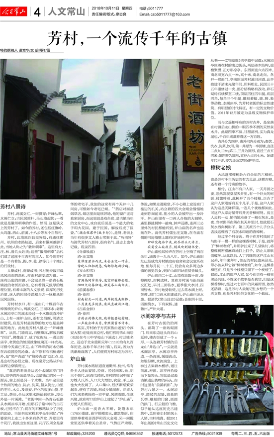 “真正的老街是从这个水阁凉亭门开始,凉亭的外面是埠头,也是钱江的另一个源头,靠上面是另一个水碓。当年这里是个热闹的地方,洗衣,洗菜,船来筏走,山里的毛竹、木头,及淳安、开化的很多山货、手工品、茶油,全从这里水路运到杭州,埠头外是一片溪滩。”老街中间一条青石板路从水阁凉亭开始,但那石子路中间的古石板,已经不在了;现在的石板路缺少了历史的印迹。当地书法家程君平先生回忆:“外婆家向上走二十多米有条弄堂,弄堂里有个花厅,我就出生在这里,花厅四周全是豪华的老宅子,我住的这家有两个天井十几间房,可惜如今老宅已倾。”“药店对面是烟草店,烟店里面是糕饼场,他的窗户正对我家厨房,而这里就是戏台底,是古镇当年的文化中心,戏台底后面是一个最大的宅子和大花园,建于民国,解放后成了区委。”(摘自程君平《故乡行》)。是呀,老街上当年有很多文人雅士常聚于此,“听雨轩”与清代芳村八景诗,很有名气,县志上也有记载。现录四首: