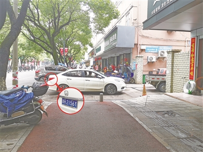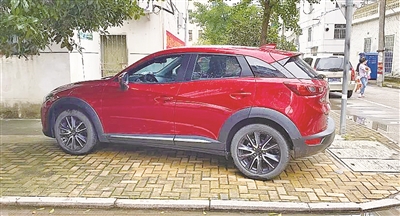 文峰东路人行道中间成了停车处,驾驶人无视过往行人是否方便,只图自个儿方便。拍摄于5月26日12点