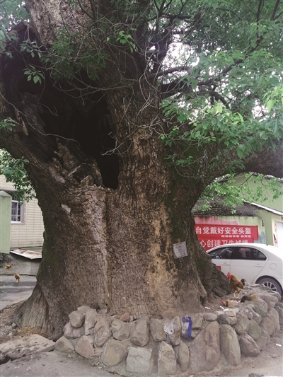 我们顺着公路右拐,穿过村庄,继续往山水田林深处开进,郁郁葱葱的绿道,蜿蜒着,延伸着。转过一片山脊,爬过一段陡坡,山背的中心村到了。映入眼帘的是一棵大伞如云的大樟树,热情地迎接我们的到来。走近一看,挂牌树龄610年。古樟枝叶在屋顶上摇曳,树冠在蓝天中蔽日。古樟树下是一方大池塘,周围种着花花草草,还有健身场地,沿边错落有致地安居着几十户人家。一群孩童在樟树下嬉笑打闹,白发的爷爷奶奶们在树底下乘凉闲谈,人和古树和池塘,连同整座村子一派祥和,我们仿佛走进了世外桃源。