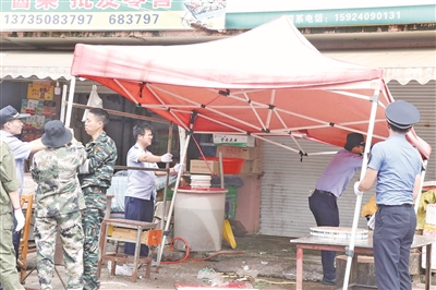 日前,天马街道联合县市场监督管理局、综合行政执法局,以“创文”为抓手,对农贸市场乱搭乱建、乱堆乱放、乱扯乱挂、占道经营等问题进行集中整治,加强农贸市场常态化管理。记者 徐露霞 通讯员 樊姝婷 摄
