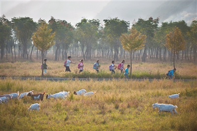 在辉埠镇宋畈村,一队小学生蹦蹦跳跳地走在放学的路上,与一旁的羊群及秋景构成了一幅美丽的画卷。王一群