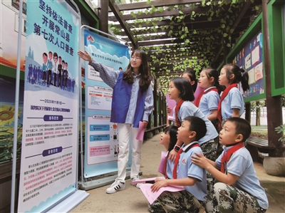 9月18日,白石镇“8090新时代理论宣讲团”成员走进白石中心小学开展第七次全国人口普查宣讲活动。通过观看“胡柚娃”动画宣传片、展板海报,政策宣讲、现场互动等,同学们了解了人口普查的意义、时间、对象、登记方式等知识。图为宣讲团成员李婷正在向同学们介绍人口普查知识。郑建荣 徐丽娟