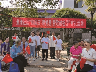 9月28日上午,紫港社区举办升国旗仪式,并开展”迎国庆 颂党恩 赞歌献祖国”有礼活动,共60余名社区居民参加活动。活动中,大家用红歌为祖国献上真挚的祝福,演唱者感情充沛,观众热情洋溢,群情激昂,现场一片欢声笑语 。随后社区志愿者还分组展开除杂草、捡烟头、大扫除等有礼活动。通过此次活动,增强了大家的民族理想信念和文化自信,营造了欢乐喜庆、文明祥和的节日氛围。通讯员 夏冬冬 徐沁 摄