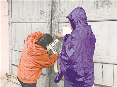 10月20日,西门片区第十五网格工作组成员兵分四路,冒雨深入被征收户家,开展腾空工作。截至目前,西门片区第十五网格内原酒厂临时工宿舍26户住户已有5户完成腾空,预计11月5日前全部腾空。图为工作人员为腾空房屋贴上封条。