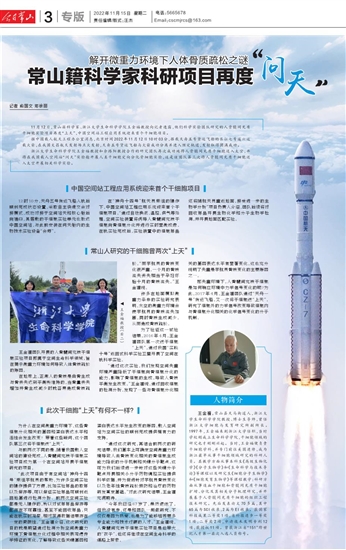 11月12日,常山籍科学家、浙江大学生命科学学院王金福教授向记者透露,他们科学实验团队研究的人骨髓间充质干细胞实验项目再度“上天”,中国空间站工程应用系统迎来首个干细胞项目。