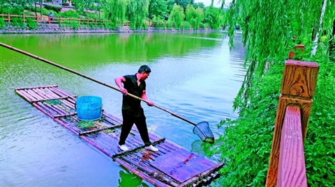 7月25日一早,在县城内河里,清洁工划着小竹筏打捞河面上的垃圾、杂草等。“这些垃圾影响城市美观又会污染水质,与我们的文明城市环境格格不入。近期,我们也会增加打捞频率,助力省级文明城市复评。”正在清洁的师傅说。