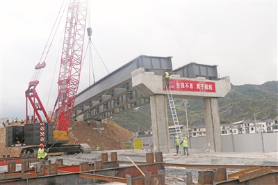 近日,351国道西坑溪大桥首片钢箱梁吊装完成,标志着大桥全面进入上部结构施工阶段。351国道(常山段)项目全线15座桥梁,西坑溪大桥是唯一一座钢混组合梁桥,是351国道(常山段)项目控制性工程之一。该桥梁地处米屯坝隧道出口,上跨S48省道,施工组织难度大。通讯员 柴新波 摄