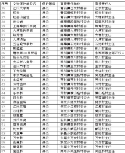 根据国务院办公厅《关于进一步加强文物安全工作的实施意见》(国办发〔2017〕81号)、浙江省人民政府办公厅《关于进一步加强文物安全工作的若干意见》(浙政办发〔2018〕17号)精神,遵循“坚持谁管理谁使用谁负责”的原则,切实落实我县“文物安全直接责任人公告公示制度”,接受社会监督。经前期摸排,报县政府办公室同意,现将我县各级文物保护单位安全工作直接责任单位(人)名单公布如下:
