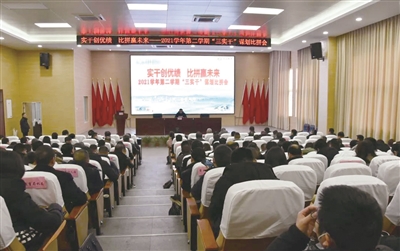 日前,县教育局举办“2021学期第二学期‘三实干’谋划比拼会”。活动以“擂台比拼”为载体,对各校领导班子和干部队伍进行公开检验,在教育系统营造了“比、学、赶、超”浓厚氛围。比拼会中,被随机抽中的教师针对本校队伍建设、质量提升和安全教育三个方面进行介绍,评委进行现场点评。